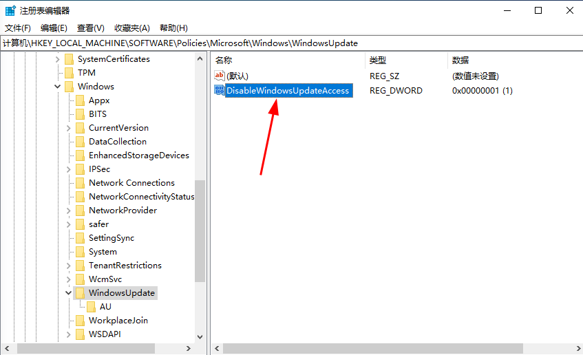 在 WindowsUpdate 下右键点击,选择 新建 > DWORD (32位) 值,命名为 DisableWindowsUpdateAccess,并将其值设置为 1