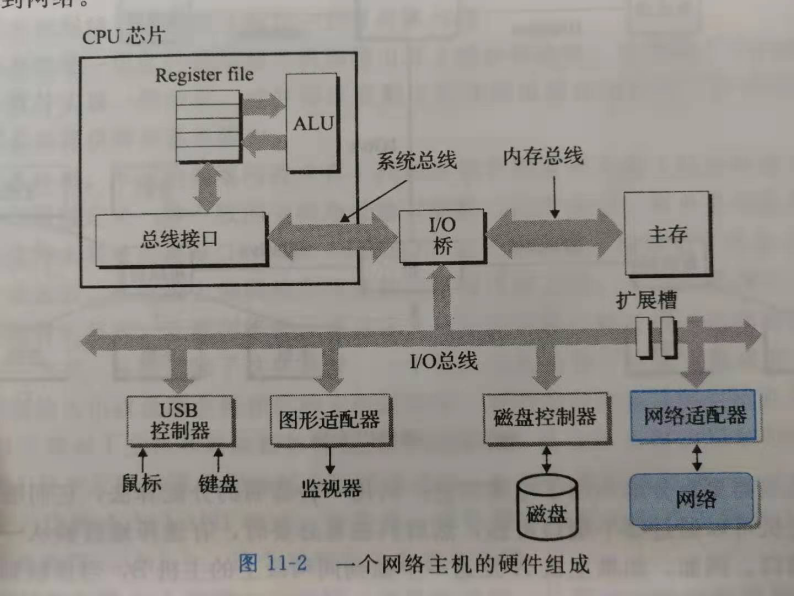电脑主机通过网络适配器连接到网络,网络适配器+网络可抽象为与磁盘控制器+磁盘类似的i/o设备。网络传来的数据通过适配器,i/o总线等复制到内存,等待cpu的处理,同样可以将主机的数据发送到网络中。