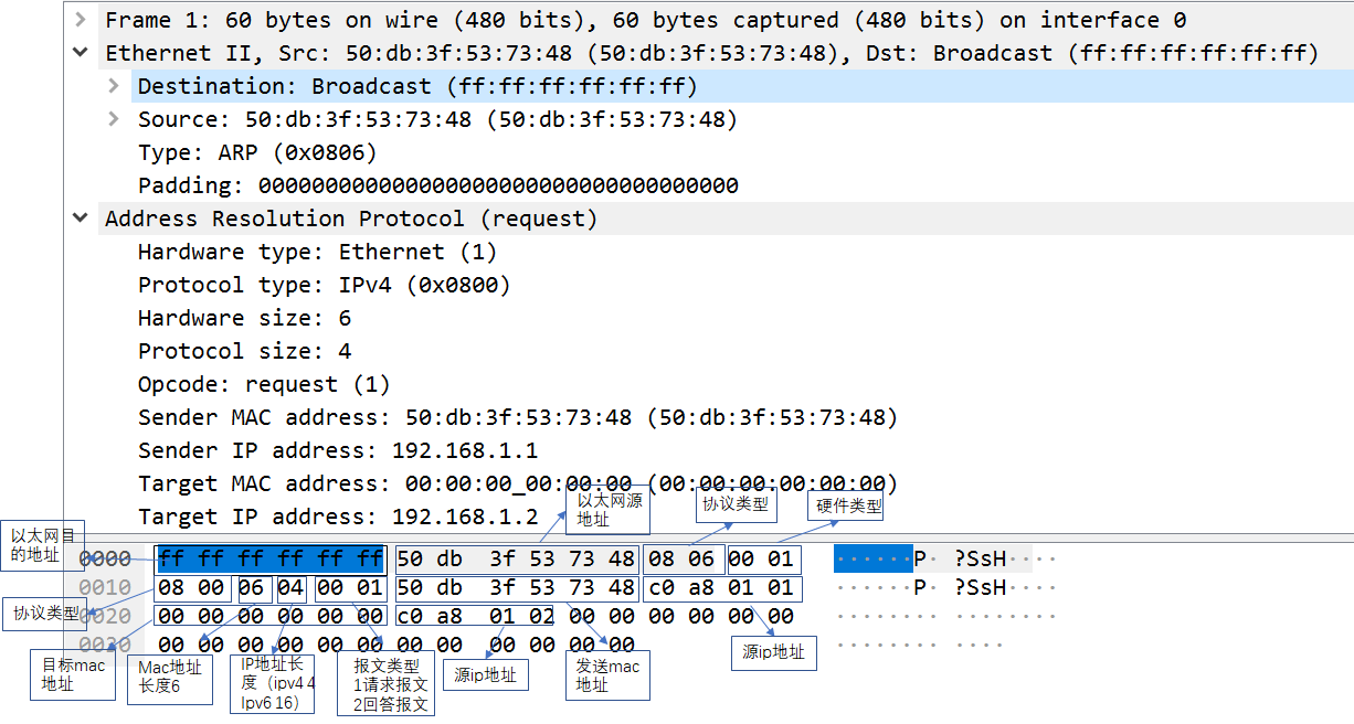 ARP请求报文:以太网目标地址为FF-FF-FF-FF-FF-FF(用于广播),目标硬件地址为00-00-00-00-00-00,其他项依次正常填入。