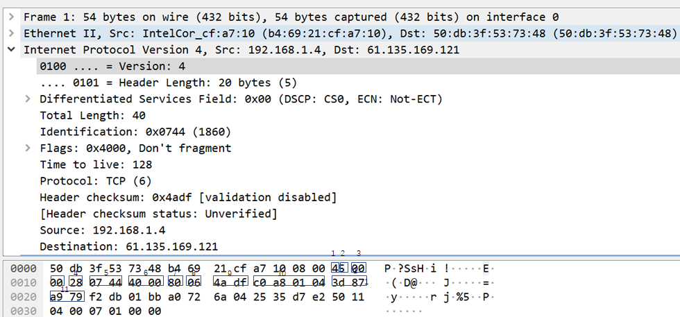 第三位MF:DF为0时才有意义,MF=1时表示该序号之后还有分片,MF=0表示此片为最后一个分片。