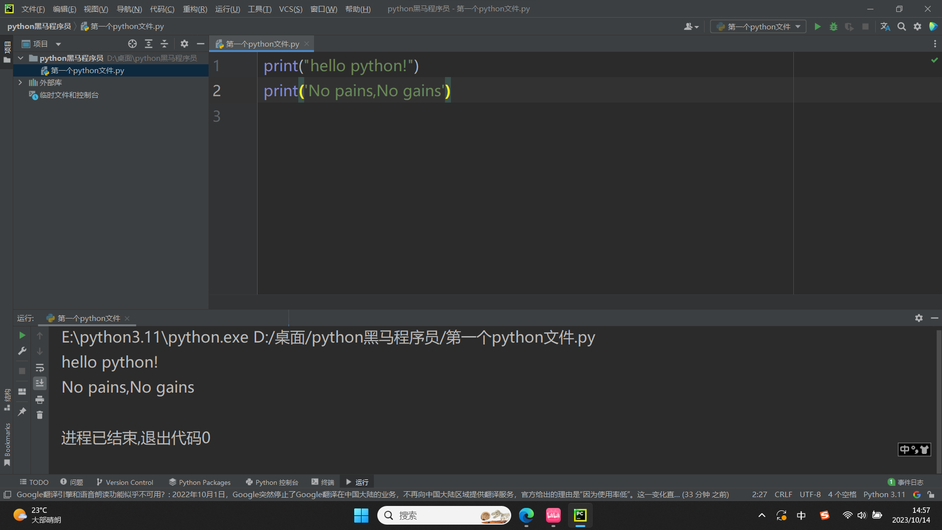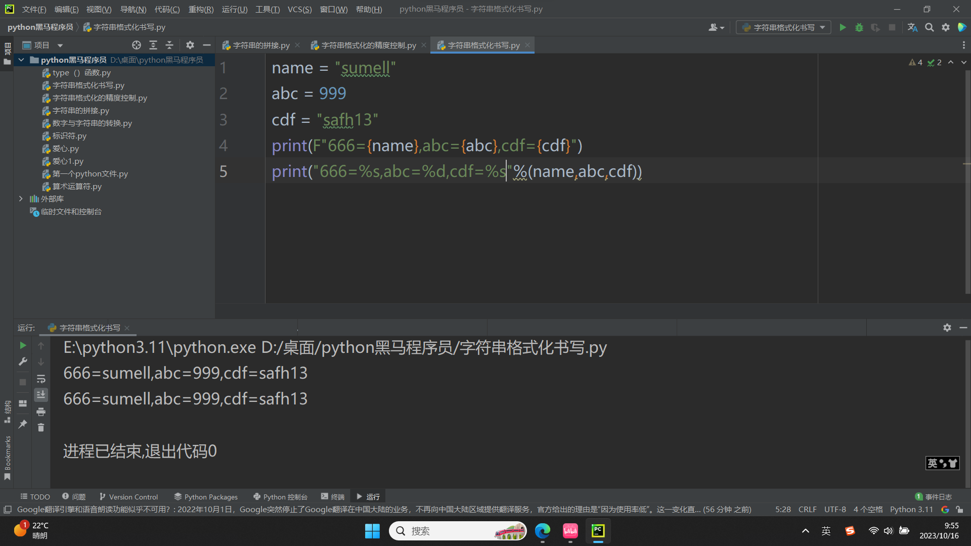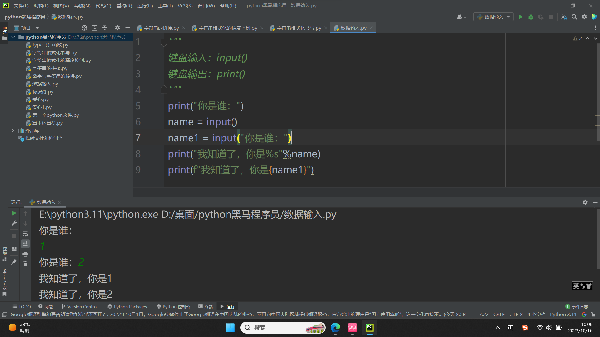 1 """ 2 我们可以使用辅助符号”m. n“来控制 3 ~ m,控制宽度,要求是数字(很少使用),设置的宽度小于数字自身,不生效 4 ~ n,控制小数点精度,要求是数字,会进行小数的四舍五入 5 eg:%5d:表示将整数的宽度控制在5位, 6 如数字11=>空空空11,不足用空格补全 7 eg:%0.2f:表示将宽度控制为5,将小数点精度设置为2 8 如数字2.245=>2.25,小数部分限制2位精度,四舍五入为2.25 9 """ 10 num1 = 11 11 num2 = 11.345 12 print("数字11的宽度限制为5,结果是:%5d"%num1) 13 print("数字11的宽度限制为1,结果是:%1d"%num1) 14 print("数字11.345宽度限制7,小数精度2,结果是:%7.2f"%num2) 15 print("数