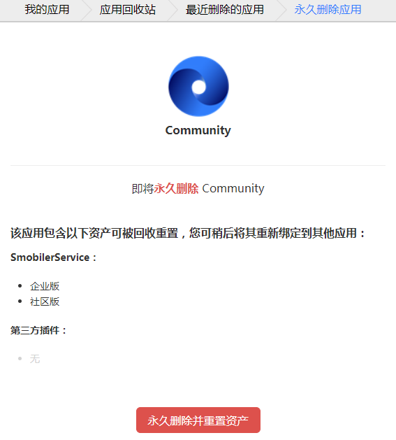 永久删除应用后,应用包含的资产即会立即解绑。