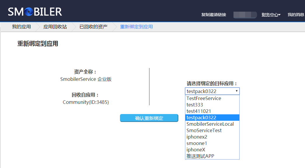 在最近回收的资产中找到你希望重用的资产,点击“重新绑定”并选择目标应用即可完成重新绑定。