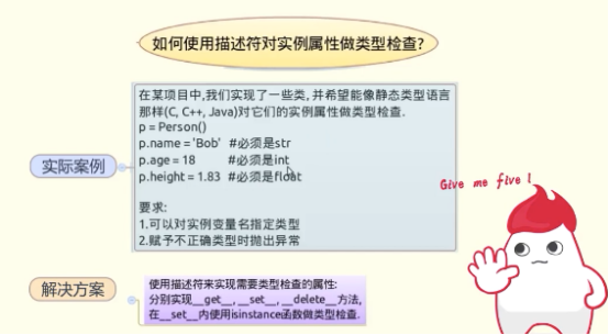 zhang = Person() #zhang.name = 89 zhang.age = "zhangliang" 输出结果: Traceback (most recent call last): File "C:/视频/python高效实践技巧笔记/7类与对象相关话题/descriptor7-6.py", line 39, in <module> zhang.age = "zhangliang" File "C:/视频/python高效实践技巧笔记/7类与对象相关话题/descriptor7-6.py", line 13, in __set__ raise TypeError("except a %s" %self.type_) TypeError: except a <type 'int'>