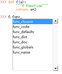 >>> f.__doc__ 'f function' >>> f.func_doc 'f function' >>>