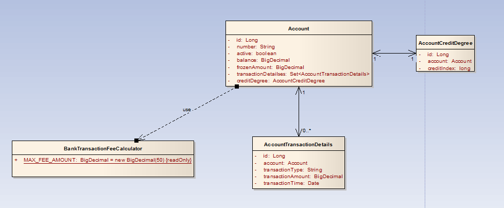 AccountTransactionDetails:账户交易明细,它从属于账户,每个账户有多个交易明细,它包括以下属性:对象标识、所属账户、交易类型、交易发生金额、交易发生时间。