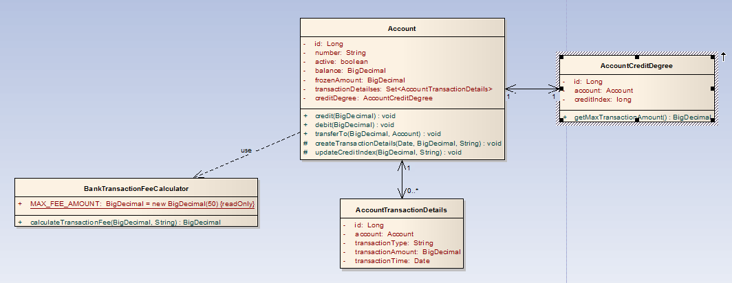 Account:账户,是整个系统的最核心的业务对象,它包括以下属性:对象标识、账户号、是否有效标识、余额、冻结金额、账户交易明细集合、账户信用等级。