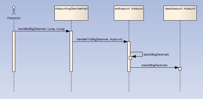 经过这样的设计,前例中所有放置在服务对象的业务逻辑被分别划入不同的负责相关职责的领域对象当中,下面的时序图描述了AccountingServiceImpl的转账业务的实现逻辑(为了简化逻辑,我们忽略掉事物、持久化等逻辑):