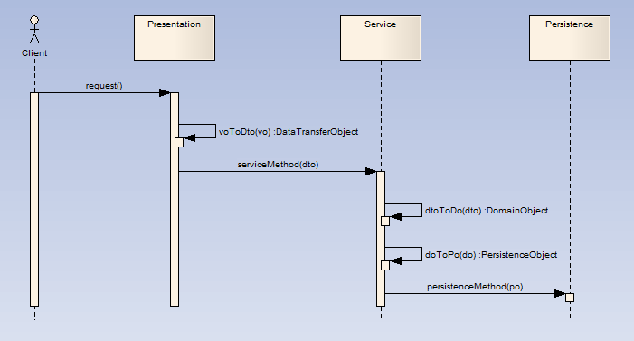 下面以一个时序图建立简单模型来描述上述对象在三层架构应用中的位置