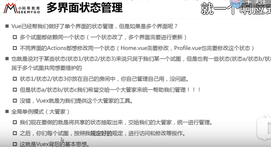 例如,组件A的状态组件B也想用,组件B的状态组件C也想用,组件C的状态。。。那么这些状态互相传递十分麻烦,多个组件可能需要共享一个状态,放在谁那里都不合适,所以找一个“管家”,这个对象负责管理这些状态。