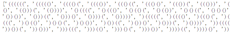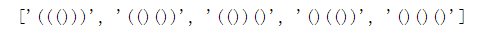 n = 3 opt = [] def khsc(ipt): if len(ipt) == n*2: opt.append(ipt) return khsc(ipt+'(') khsc(ipt+')') return khsc("") print(opt)