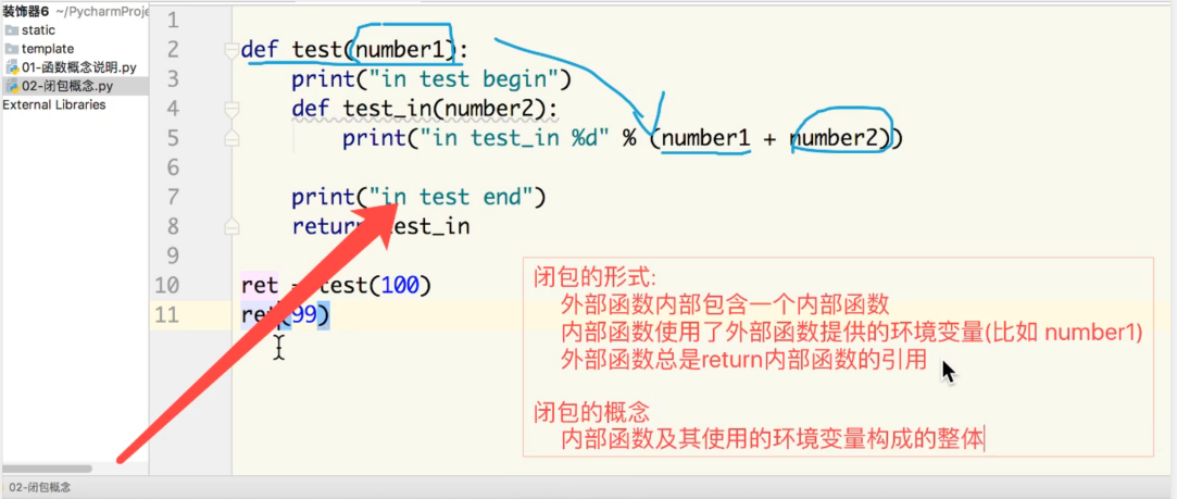 def yanzheng(func): def inner(): print("正在验证1 2 3") func() print("执行完成") return inner # 使用装饰器的形式 @装饰器函数 @yanzheng def f1(): print("in f1") """上面三行的代码等价于 def f1(): print("这是一个底层的函数") f1 = yanzheng(f1) """ # f1已经不是原来的f1了 而是一个被装饰之后的f1 f1() @yanzheng def f2(): print("in f2") f2() """装饰器函数的特点 符合闭包的基本形式 有一个函数参数是被装饰的函数的引用"""