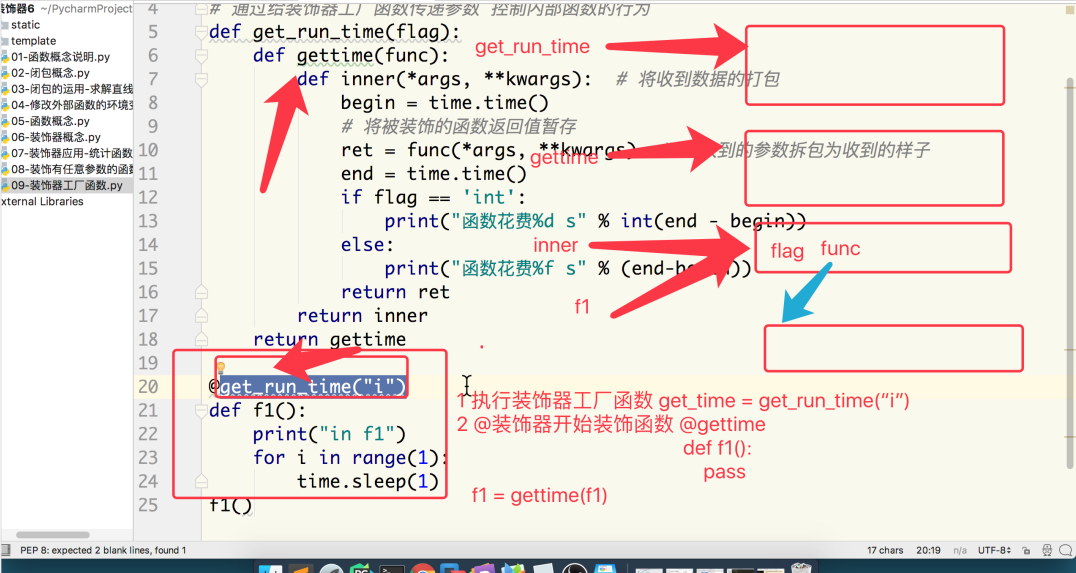import time # 产生装饰器函数的函数就是装饰器工厂 # 目的:通过给装饰器工厂函数传递参数 控制内部函数的行为 def get_run_time(flag): def gettime(func): def inner(*args, **kwargs): # 将收到数据的打包 begin = time.time() # 将被装饰的函数返回值暂存 ret = func(*args, **kwargs) # 将收到的参数拆包为收到的样子 end = time.time() if flag == 'int': print("函数花费%d s" % int(end - begin)) else: print("函数花费%f s" % (end-begin)) return ret return inner return gettime @get_run_time("int") def f1(): print("in f1") for i in range(1): time.sleep(1) f1()