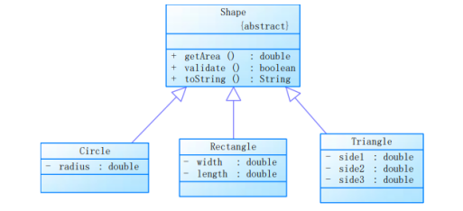 1 class Triangle extends Shape{ 2 private double side1; 3 private double side2; 4 private double side3; 5 public Triangle() { 6 } 7 public Triangle(double side1, double side2, double side3) { 8 super(); 9 this.side1 = side1; 10 this.side2 = side2; 11 this.side3 = side3; 12 } 13 public double getSide1() { 14 return side1; 15 } 16 public void setSide1(double side1) { 17 this.side1 = side1; 18 } 19 public double getSide2() { 20 return side2; 21 } 22 public void setSide2(double side2) { 23 this.side2 = side2; 24 } 25 public double getSide3() { 26 return side3; 27 } 28 public void setSide3(double side3) { 29 this.side3 = side3; 30 } 31 32 public double getArea() { 33 // TODO Auto-generated method stub 34 double p = (side1 + side2 + side3) / 2; 35 double area = Math.sqrt(p * (p - side1) * (p - side2) * (p - side3)); 36 return area; 37 } 38 39 public boolean validate() { 40 // TODO Auto-generated method stub 41 double[] side = {side1 , side2 , side3}; 42 Arrays.sort(side); 43 if(side[0] > 0 && side[1] > 0 && side[2] > 0) { 44 if(side[0] + side[1] > side[2]) 45 return true; 46 else 47 return false; 48 }else 49 return false; 50 } 51 52 }