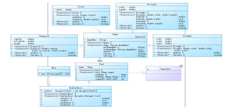 第一题是较为简单的图形卡片排序,根据第一行数字所代表的卡片图形类型,依次输入各图形的相关参数,通过代码实现排序前的各图形类型及面积、排序后的各图形类型及面积及所有图形的面积总和。第二题是第一题的进阶版,图形卡片分组游戏,需要用到类的继承。多态性使用以及接口的应用,根据第一行数字所代表的卡片图形类型,依次输入各图形的相关参数。参考类图如下:
