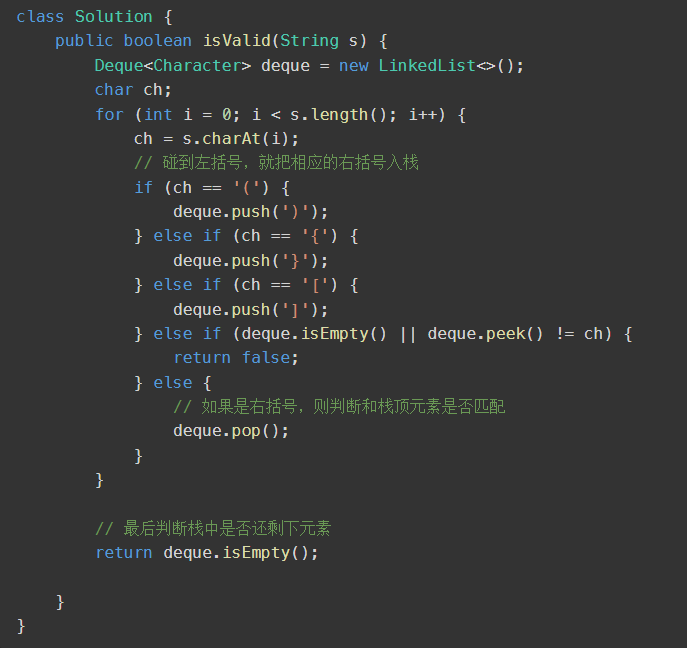 思路:采用栈数据结构解题;遇到左括号,压右括号入栈