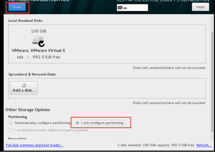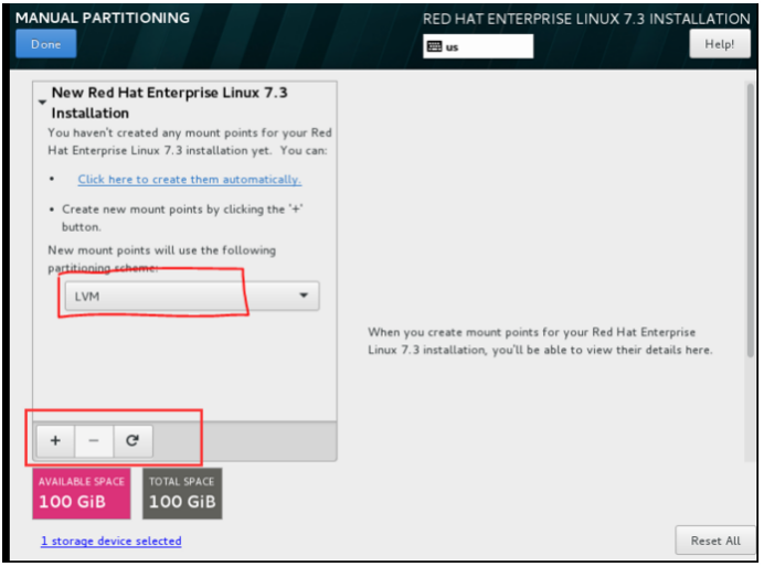 选择手动分区,再按Done进入手动配置分区界面,根据下面分区表格规划进行分区。