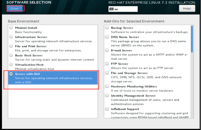 安装组件选择“Server with GUI”,并选择“hardware Monitoring Utilities”、“Large systems performance”、“Performance Tools”、“Remote Management For Linux”、“Security To
