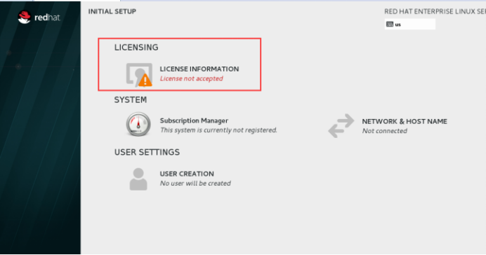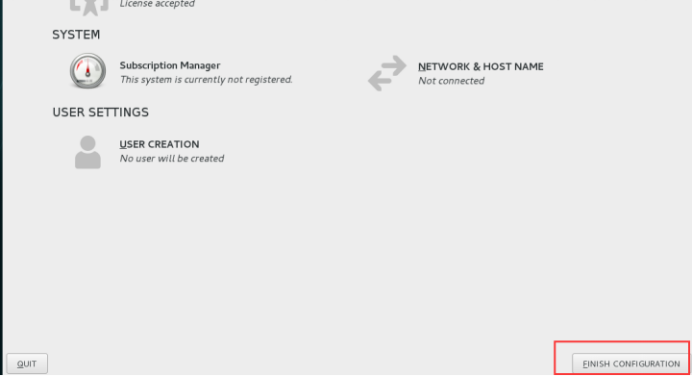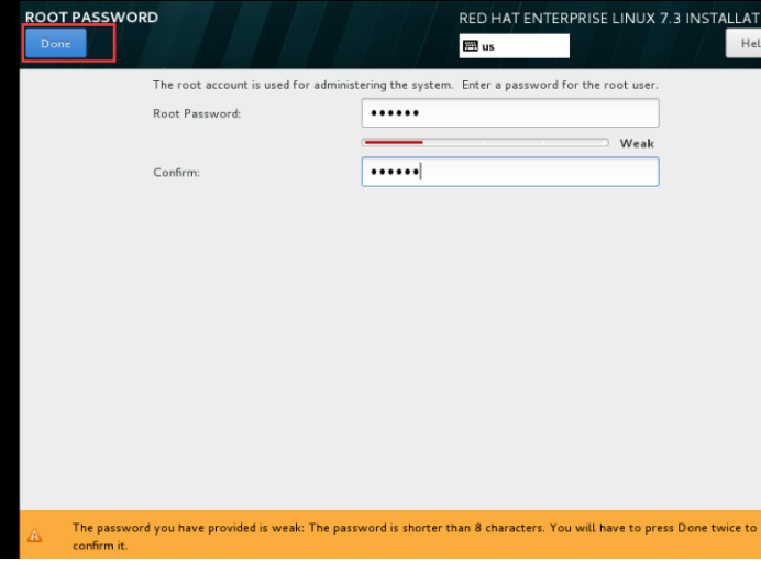 点击”root password”设置root密码,密码设置遵照规范。如果提示密码过于简单,点击两次“Done”完成配置;