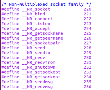 文件~/kernel/linux-5.0.1/arch/sh/include/uapi/asm/unistd_64.h为每个系统调用规定了唯一的编号,其中与socket有关的如下: