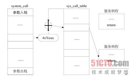 通过软中断0x80,系统会跳转到一个预设的内核空间地址,它指向了系统调用处理程序(不要和系统调用服务例程相混淆),即在arch/i386/kernel/entry.S文件中使用汇编语言编写的system_call函数。