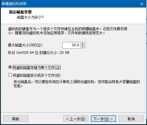 选择磁盘容量,注意这里的”磁盘容量“不是指虚拟机占用多少空间,而是虚拟机最大占用空间,虚拟机的空间是随着你的使用而变化的,比如系统占用7GB,文件是2GB,虚拟机占用实体主机空间大概是10GB,当这个占用容量达到20GB就会限制。