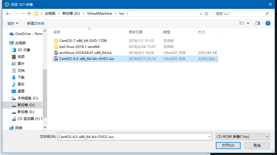 点击”新CD/DVD“——”使用ISO映像文件“——“浏览”———选择你已经下载的CentOS6.5ISO文件