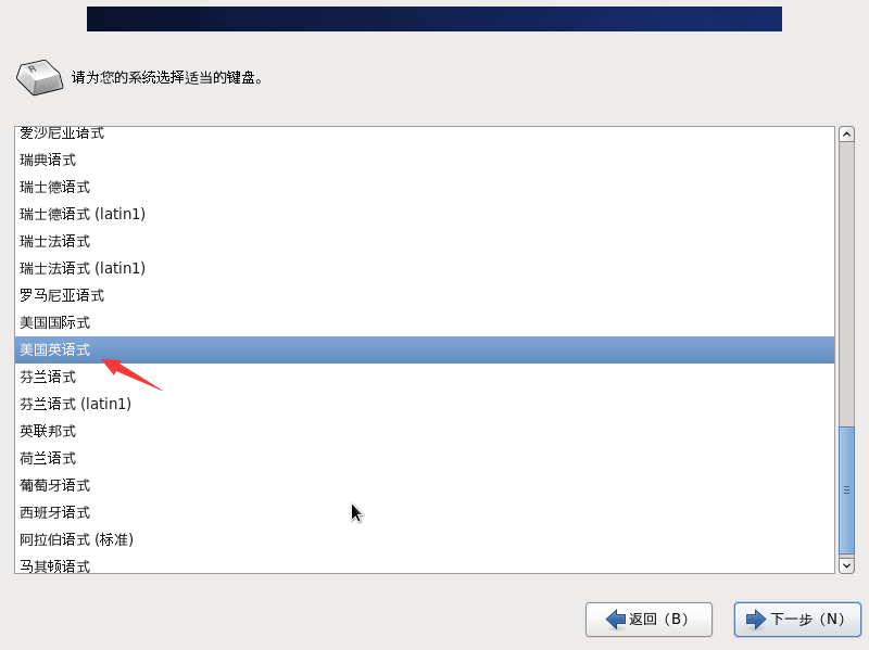 选择安装字体“中文”——”下一步“——键盘安装“美国英语式”——“下一步”