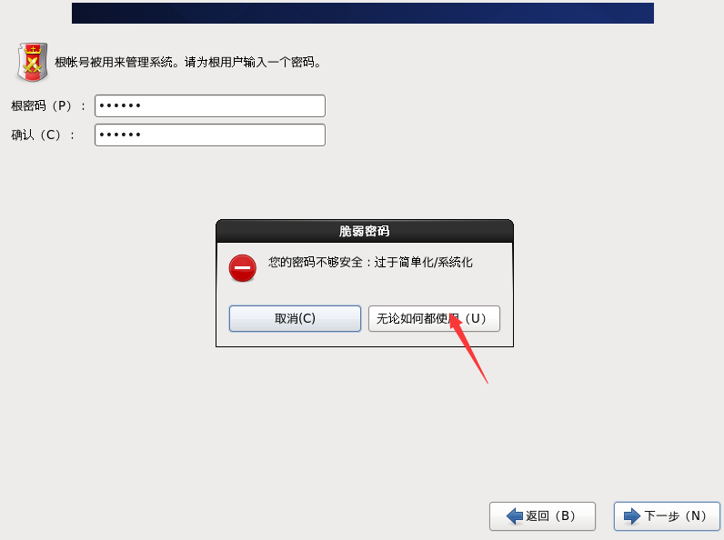 "根密码“是root(最高权限)账户的密码,这里用作学习,设置简单易记的六位字母,数字,下划线,我写的是”123456“——提示过于简单——忽略,点击”无论如何都使用“——”下一步“