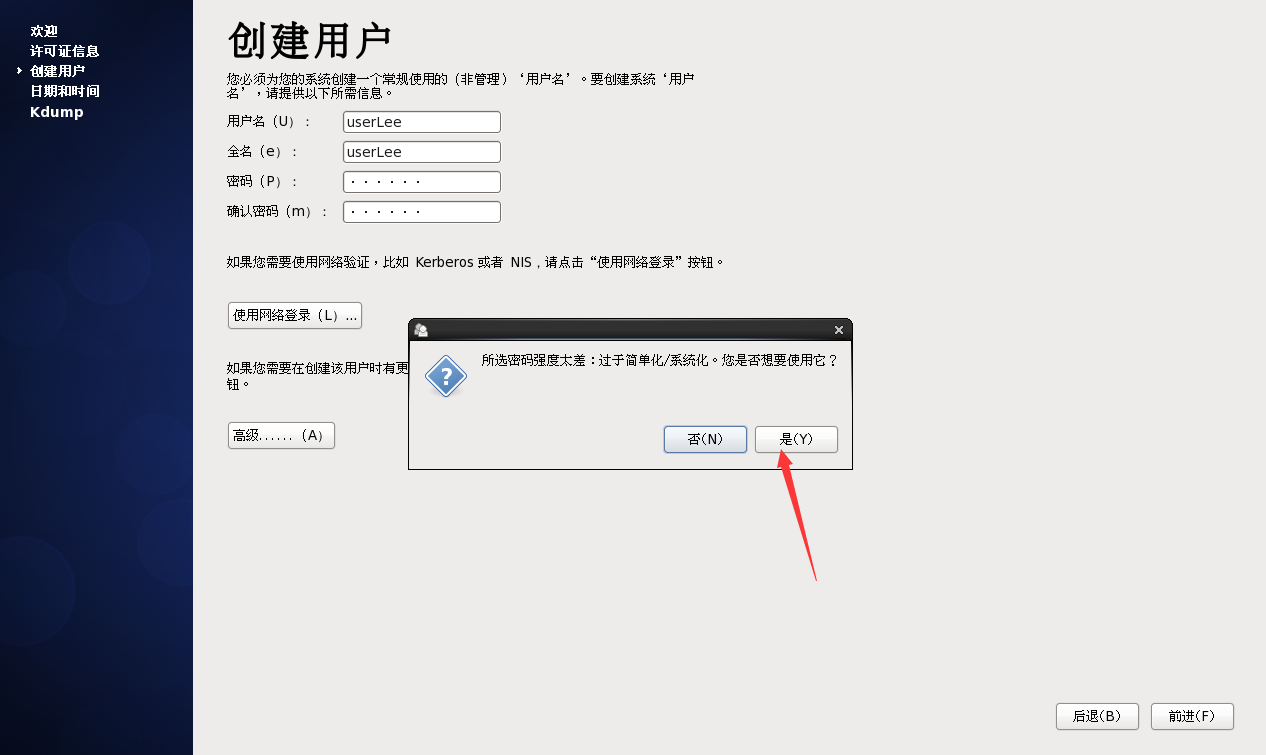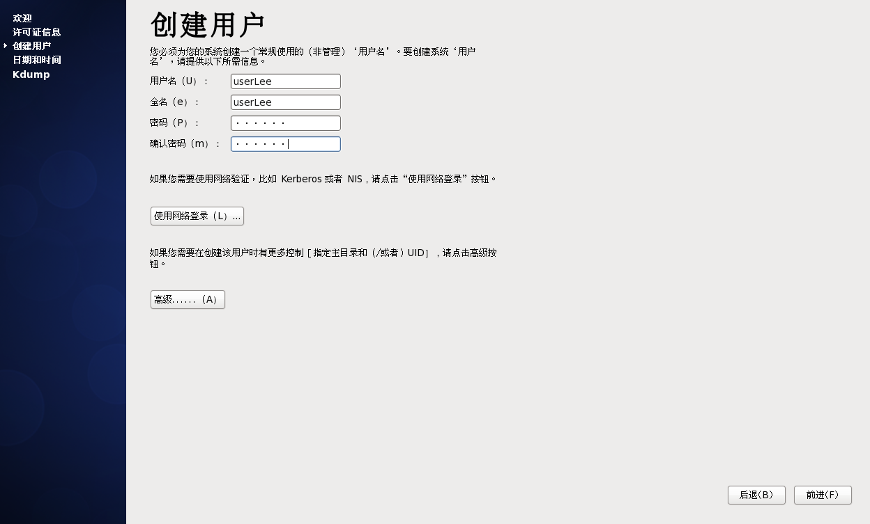 ”创建用户“——设置“用户名”“密码”——“前进”
