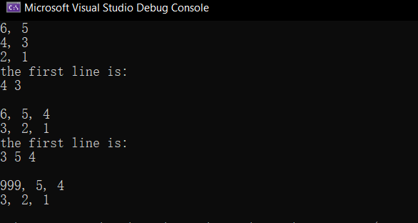 1 #include "matrix.hpp" 2 int main() 3 { 4 using namespace std; 5 double x[] = {6, 5, 4, 3, 2, 1}; 6 Matrix m1(3, 2); // 创建一个3×2的矩阵 7 m1.set(x); // 用一维数组x的值按行为矩阵m1赋值 8 m1.print(); // 打印矩阵m1的值 9 cout << "the first line is: " << endl; 10 cout << m1.at(1, 0) << " " << m1.at(1, 1) << endl; // 输出矩阵m1第2行两个元素的值 11 cout << endl; 12 Matrix m2(2, 3); 13 m2.set(x); 14 m2.print(); 15 cout << "the first line is: " << endl; 16 cout << m2.at(1, 0) << " " << m2.at(0, 1) << " " << m2.at(0, 2) << endl; 17 cout << endl; 18 Matrix m3(m2); // 用矩阵m2构造新的矩阵m3 19 m3.set(0, 0, 999); // 将矩阵m3第0行第0列元素值设为999 20 m3.print(); 21 }