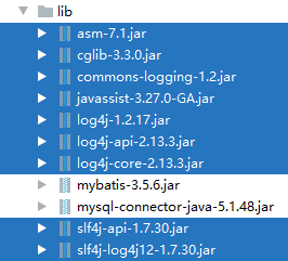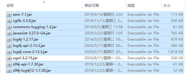所需jar包在mybatis包中:mybatis-3.5.6-->lib-->除ognl-3.2.15.jar外的所有jar包