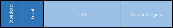 OUI(组织唯一标识符)不同厂商的标志不一样 24位,通过这个可以判断厂商 +Vendor Assigned(24位不可重复 本地唯一 仅限大陆使用 本地唯一地址)