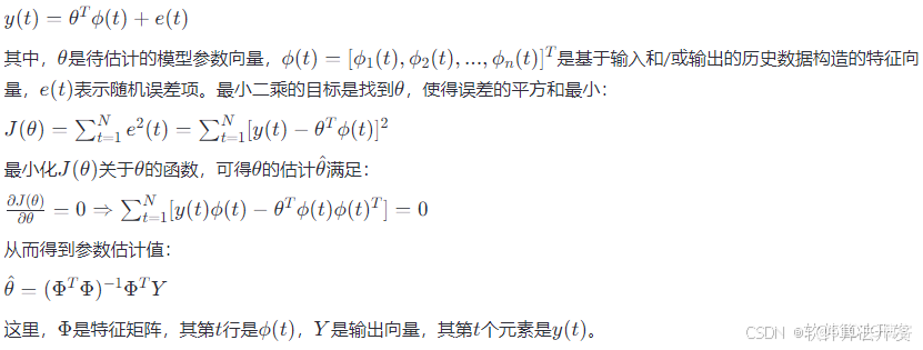 最小二乘法是一种常用的数据拟合技术,它旨在找到一组模型参数,使得模型预测值与实际观测值之间的误差平方和最小。对于一个线性动态系统,如果我们假设系统的输出y(t)与输入u(t)之间存在如下关系(离散时间表示):