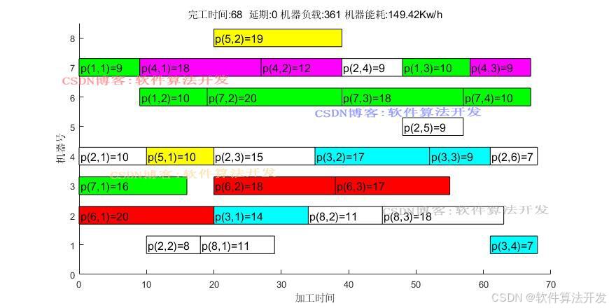 基于NSGAII的的柔性作业调度优化算法MATLAB仿真,仿真输出甘特图,完工时间:,延期,机器负载,机器能耗。