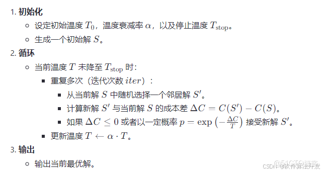 模拟退火算法通过一个温度参数T 控制搜索过程。在初始阶段,T 设定得很高,允许算法接受劣质解(即成本增加的解)。随着算法运行,T 逐渐降低,最终趋向于零。这样,算法能够跳出局部最优解,探索更广阔的解空间,最终收敛到全局最优解或接近最优解。