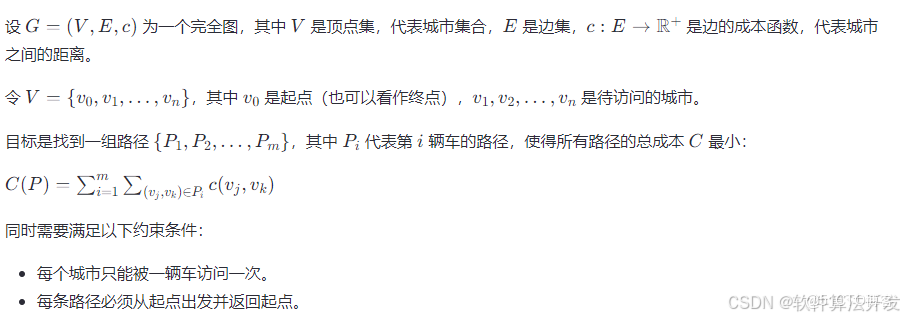 多车辆旅行商问题(VRPMTS)是指给定一组城市和一组车辆,要求为每辆车规划一条路径,使得每辆车从起点出发,访问所有城市恰好一次,并最终回到起点,同时使总的旅行成本最小化。