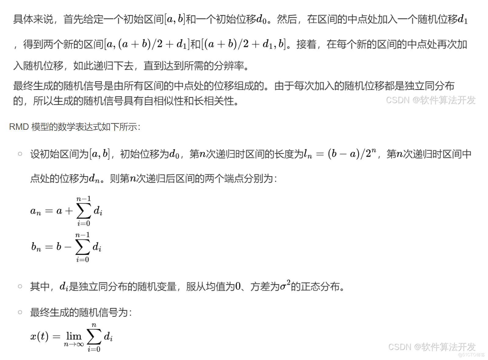 RMD 模型是一种基于分形理论的随机信号生成方法。它通过递归地在区间的中点处加入随机位移,生成具有自相似性和长相关性的随机信号。