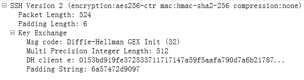 这其中第二部分是ssh最为核心的过程,该过程决定了以后通信所要使用的密钥,下面按顺序对每个部分对比着数据包进行详细的讲解并给出实现的过程。