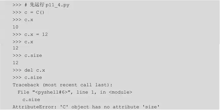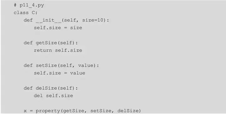 property()返回一个可以设置属性的属性,当然如何设置属性还是需要人为来写代码。第一个参数是获得属性的方法名(例子中是getSize),第二个参数是设置属性的方法名(例子中是setSize),第三个参数是删除属性的方法名(例子中是delSize)。