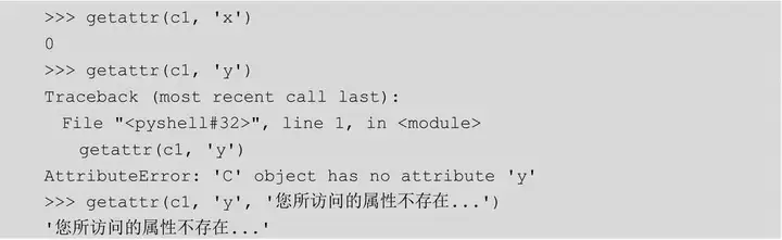 返回对象指定的属性值,如果指定的属性不存在,则返回default(可选参数)的值;若没有设置default参数,则抛出ArttributeError异常。