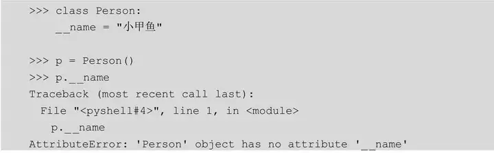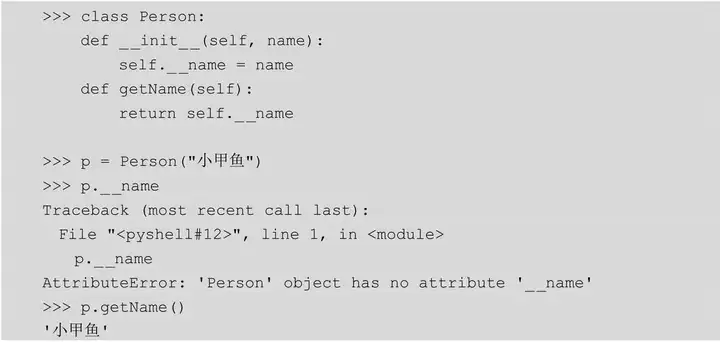 为了实现类似私有变量的特征,Python内部采用了一种叫Name Mangling(名字改编)的技术,在Python中定义私有变量只需要在变量名或函数名前加上“_ _”两个下画线,那么这个函数或变量就会成为私有的了: