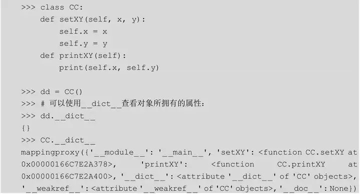 只属于dd而不属于CC的原因是:self参数,当实例对象dd去调用setXY方法的时候,它传入的第一个参数就是dd,那么self.x = 4,self.y = 5也就相当于dd.x = 4,dd.y = 5,所以在实例对象甚至类对象中,都看不到x和y,因为这两个属性是只属于实例对象dd的。