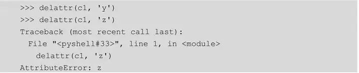 与setattr()相反,delattr()用于删除对象中指定的属性,如果属性不存在,则抛出AttributeError异常。
