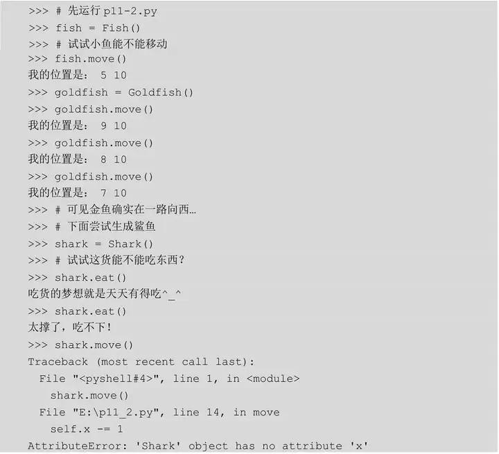 鲨鱼(Shark)一移动就会报错,因为Shark对象没有x属性,在Shark类中,重写了魔法方法_ _init_ _,但新的_ _init_ _方法里边没有初始化鲨鱼的x坐标和y坐标,因此调用move方法就会出错。