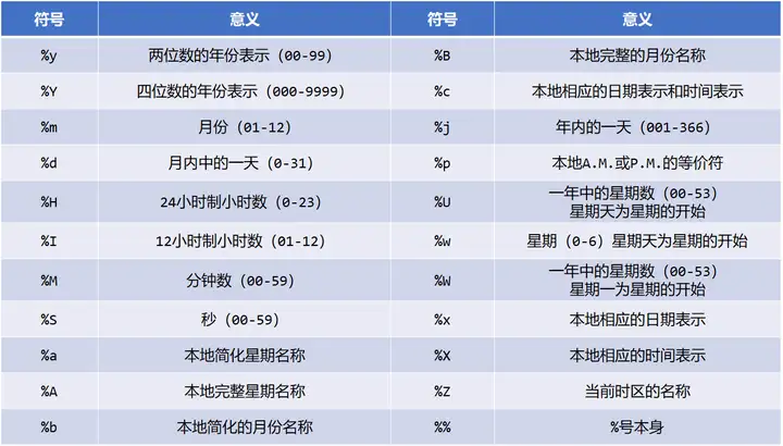 - 时间元组→自定义格式:time.strftime(<格式化的符号>,<时间元组>)