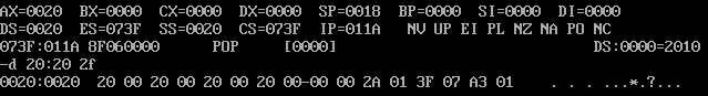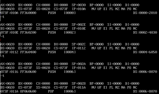 (2)push [6] 指令执行结束后, pop [6] 指令执行结束前,使用d命令 d 20:20 2f 查看此时栈空间的数据。