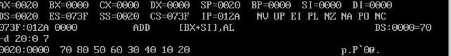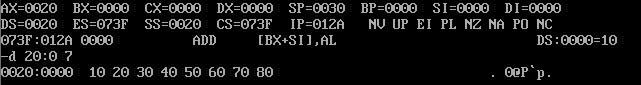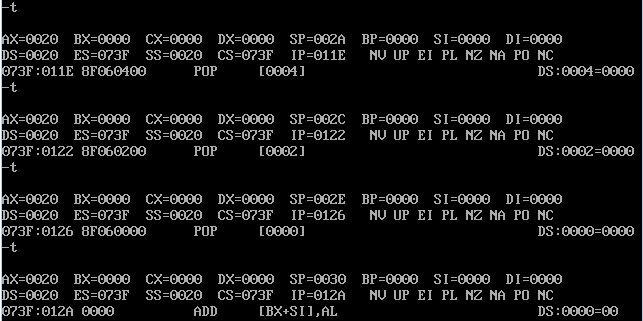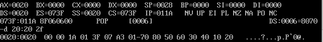 (3)pop [0] 指令执行结束后,使用d命令 d 20:0 7 查看此时数据空间内的数据,发现数据发生了变化。