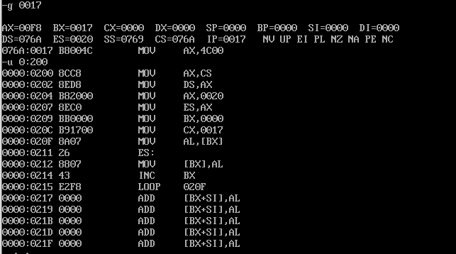 (2)在debug调试中,使用g命令将程序执行到 loop s 之后、 mov ax, 4c00h 之前,然后,使用u命令 对0:200h开始的内存单元反汇编,验证得复制成功。